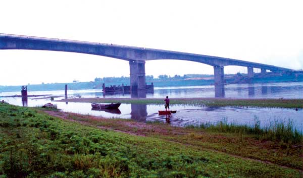 天門漢江大橋長1329米,主橋孔跨布置為(50 60) (85 116 116 85) (50 50)米三聯(lián)預應(yīng)力混凝土連續(xù)梁橋,橋?qū)?4.5米,主跨116米,樁基107根,樁徑2米,預應(yīng)力混凝土連續(xù)變截面箱梁結(jié)構(gòu),于1996年建成,被交通部授予“優(yōu)質(zhì)工程”。