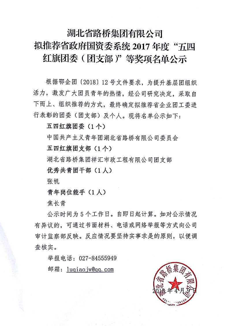 湖北省路橋集團有限公司擬推薦省政府國資委系統(tǒng)2017年度”五四紅旗團委(團支部)“等獎項名單公示