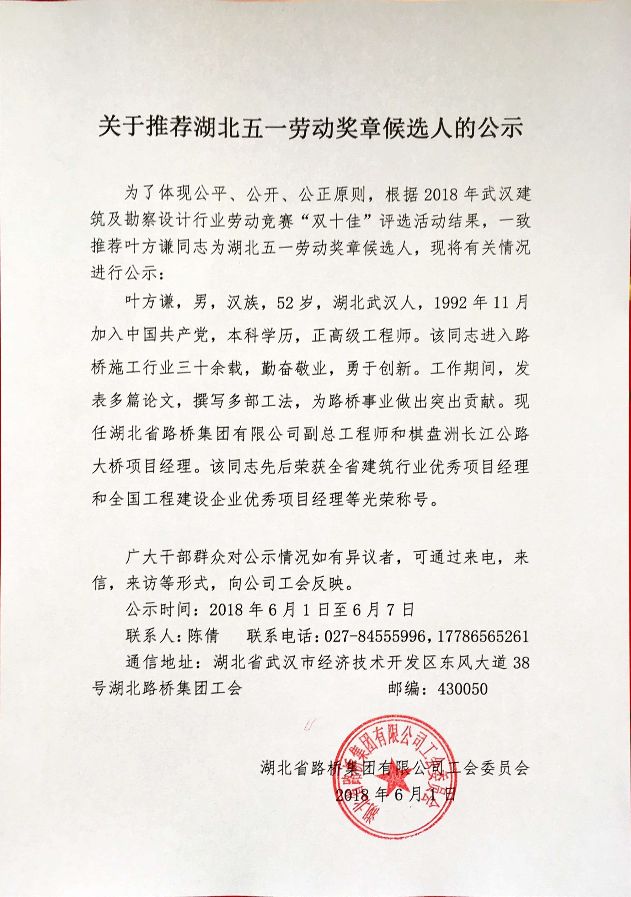 關(guān)于推薦湖北五一勞動(dòng)獎(jiǎng)?wù)潞蜻x人的公示