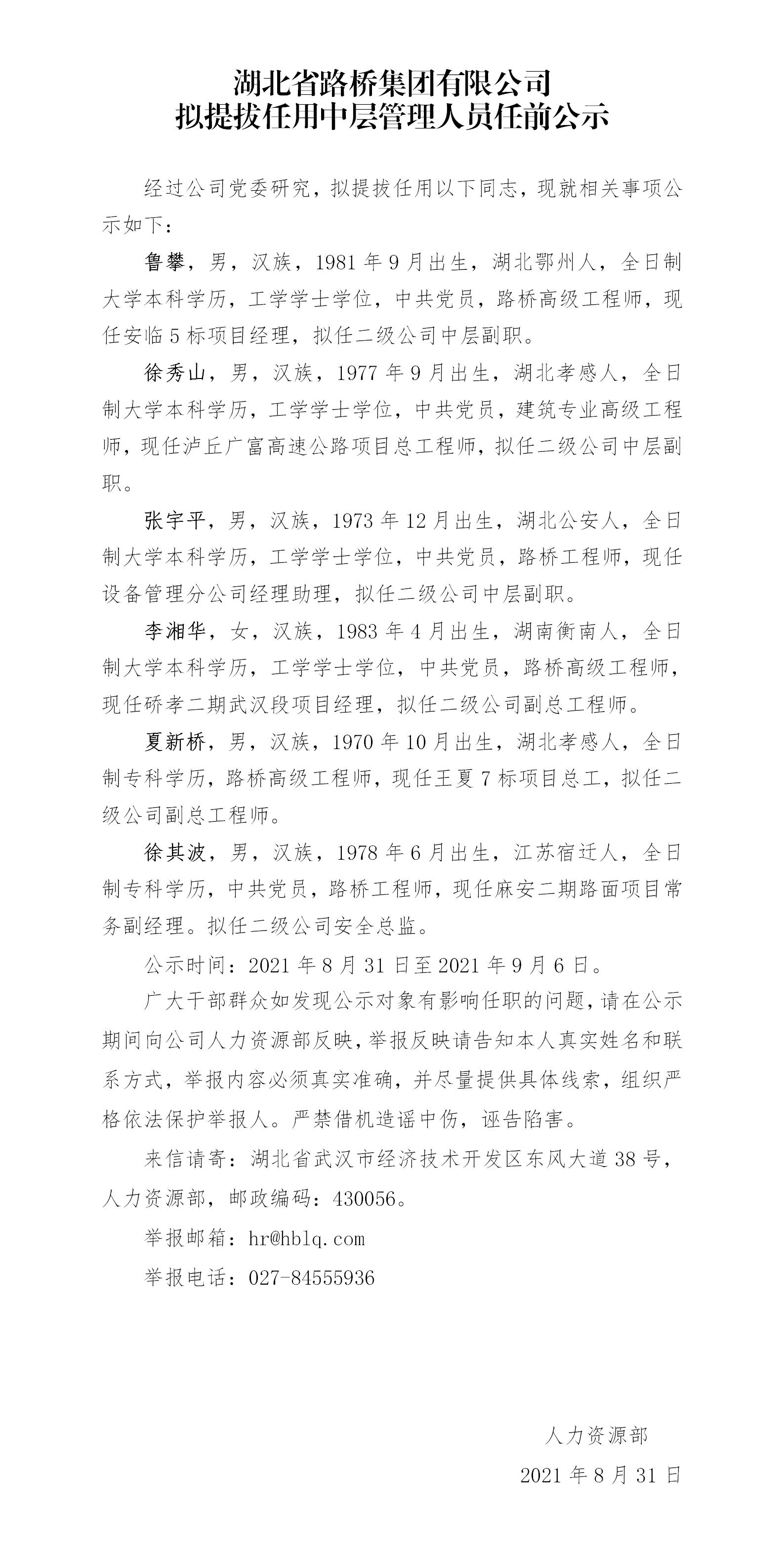 湖北省路橋集團(tuán)有限公司擬提拔任用中層管理人員任前公示