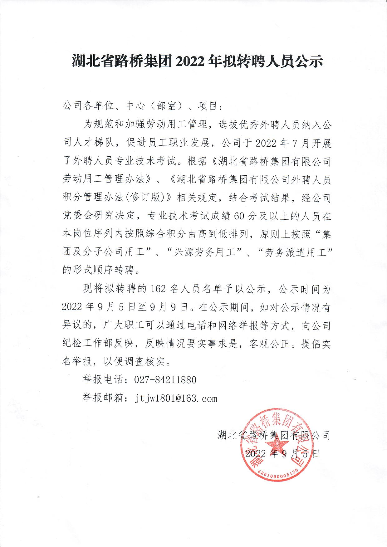 湖北省路橋集團(tuán)有限公司2022年擬轉(zhuǎn)聘人員補(bǔ)充公示