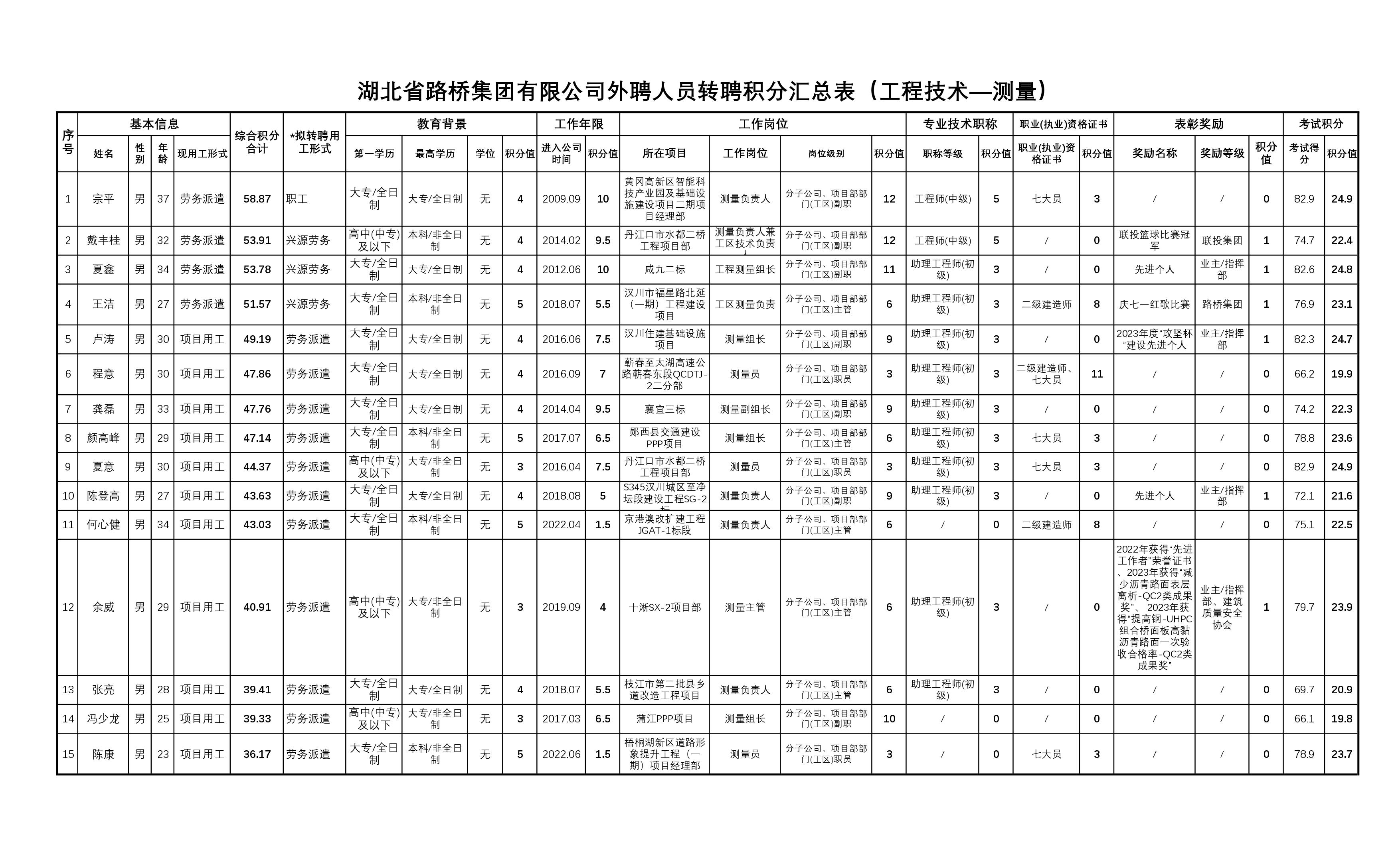 湖北省路橋集團有限公司2023年擬轉聘人員公示