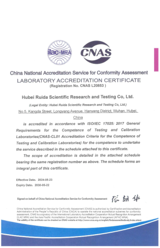 近日,湖北路橋瑞達檢測公司順利通過中國合格評定國家認可委員會(CNAS)各級審核,取得“實驗室認可證書”,標志著湖北路橋瑞達檢測公司首次躋身國家級認可實驗室行列,具備按照有關國際認可準則開展檢測服務的能力。