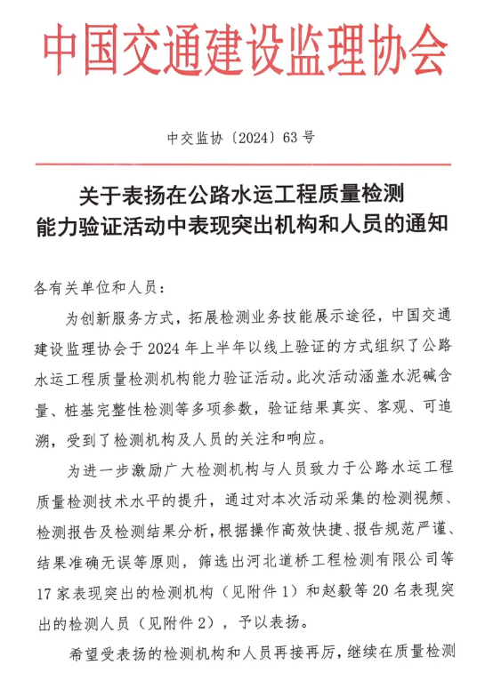 近日,中國(guó)交通建設(shè)監(jiān)理協(xié)會(huì)發(fā)布《關(guān)于表?yè)P(yáng)在公路水運(yùn)工程質(zhì)量檢測(cè)能力驗(yàn)證活動(dòng)中表現(xiàn)突出機(jī)構(gòu)和人員的通知》,湖北路橋旗下的瑞達(dá)檢測(cè)公司榮獲“表現(xiàn)突出機(jī)構(gòu)”稱(chēng)號(hào),且是湖北省內(nèi)唯一獲得表彰的檢測(cè)單位。