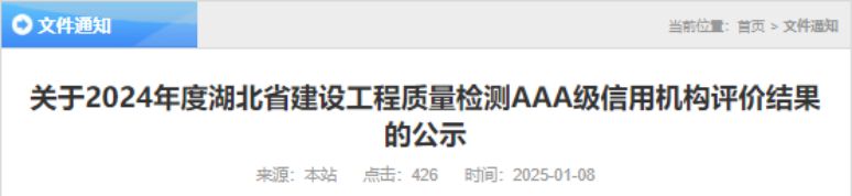 1月8日,湖北省建設(shè)工程質(zhì)量安全協(xié)會發(fā)布了2024年度湖北省建設(shè)工程質(zhì)量檢測AAA級信用機構(gòu)評價結(jié)果,聯(lián)投湖北路橋瑞達(dá)科研檢測公司憑借優(yōu)異的誠信建設(shè)和信用管理能力,榮獲最高級“AAA級”信用機構(gòu)評價。