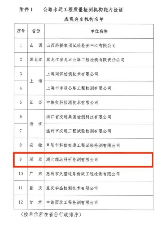 1月9日,中國交通建設(shè)監(jiān)理協(xié)會發(fā)布表彰通知,聯(lián)投湖北路橋瑞達(dá)科研檢測公司成功蟬聯(lián)第二屆公路水運工程質(zhì)量檢測能力驗證“表現(xiàn)突出機構(gòu)”榮譽。成為全省唯一一家連續(xù)兩屆獲此榮譽的檢測機構(gòu)。