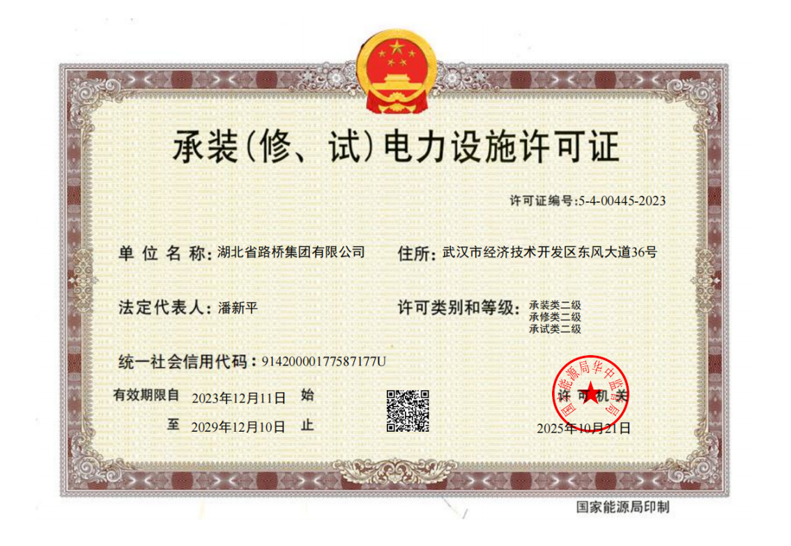 近日,經(jīng)國(guó)家能源局華中能源監(jiān)管局許可,湖北路橋成功取得“承裝(修、試)電力設(shè)施許可證二級(jí)”。
