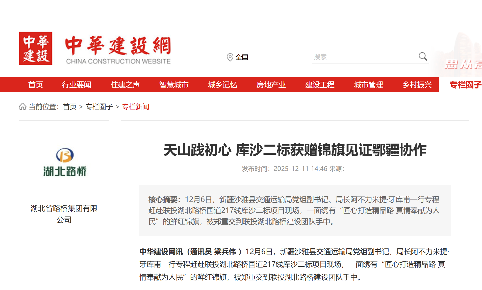 近日,聯(lián)投湖北路橋國道217線庫沙二標項目收到新疆沙雅縣交通運輸局的錦旗,中華建設(shè)網(wǎng)、經(jīng)視直播對該事件進行報道,以下是報道全文:
