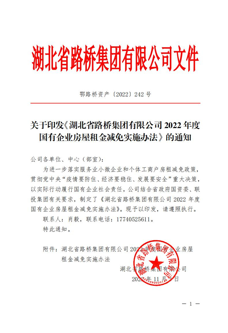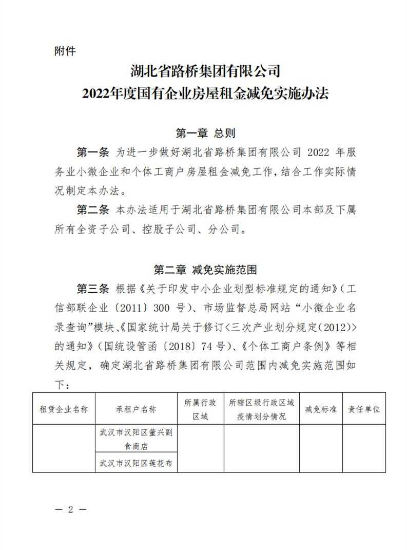 關(guān)于印發(fā)《湖北省路橋集團有限公司2022年度國有企業(yè)房屋租金減免實施辦法》的通知